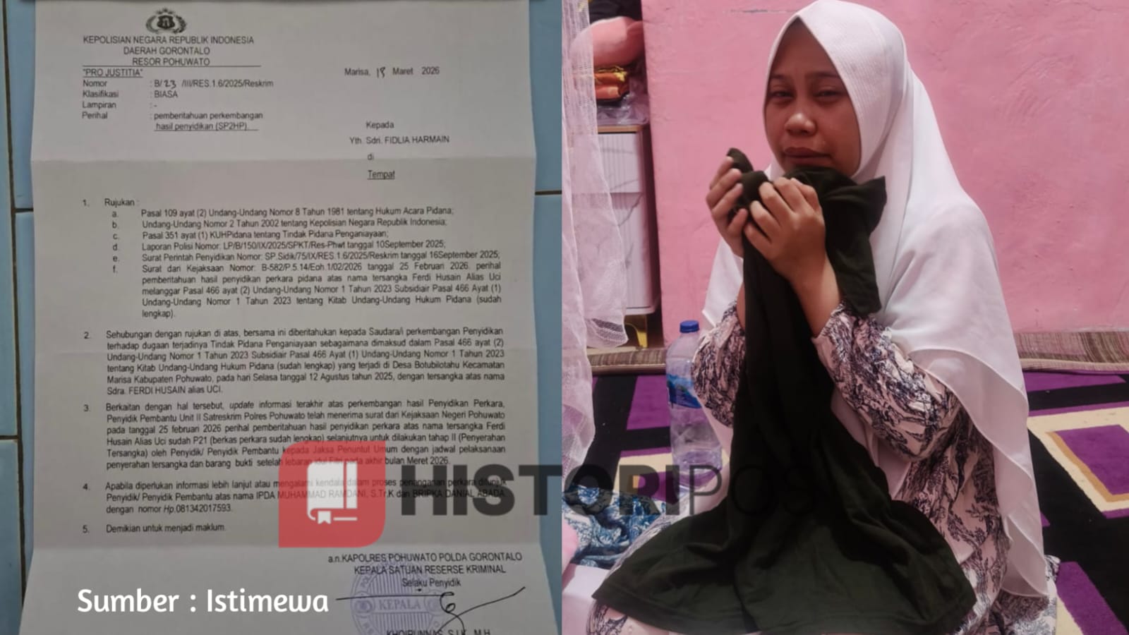 HistoriPos.com, Pohuwato — Penanganan kasus dugaan tindak pidana penganiayaan yang dialami oleh Almarhum Rezaldi Latif (Reza) di Desa Botubilotahu, Kecamatan Marisa, mulai memicu pertanyaan dari pihak keluarga korban. Meski berkas perkara atas nama berinisial FH alias Uci telah dinyatakan lengkap (P21) oleh Kejaksaan Negeri Pohuwato sejak Februari lalu, hingga kini proses pelimpahan tersangka dan barang bukti (Tahap II) belum juga terlaksana.